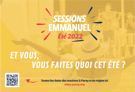 Charte graphique pour les sessions été de l'Emmanuel 2022 déclinée sur affiche A3 - encarts publicitaires Famille Chrétienne - Bannières web - Bandeau d'accueil à Paray-le-Monial.